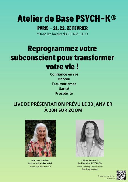 Vous trouverez également divers PSYCH-K® Ateliers de Base, des ateliers Avancés.
